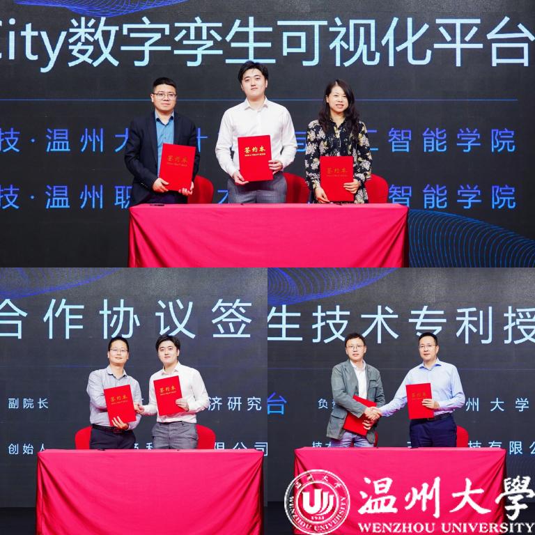 签约仪式上,温州市数字经济研究院与三缔科技有限公司签署了战略合作协议,并进行了温州市数字孪生专委会专家聘任仪式。三缔科技有限公司与瓜子tv 签署数字孪生技术专利授权,以及与两大院校签署了StarCity数字孪生可视化平台捐赠协议。