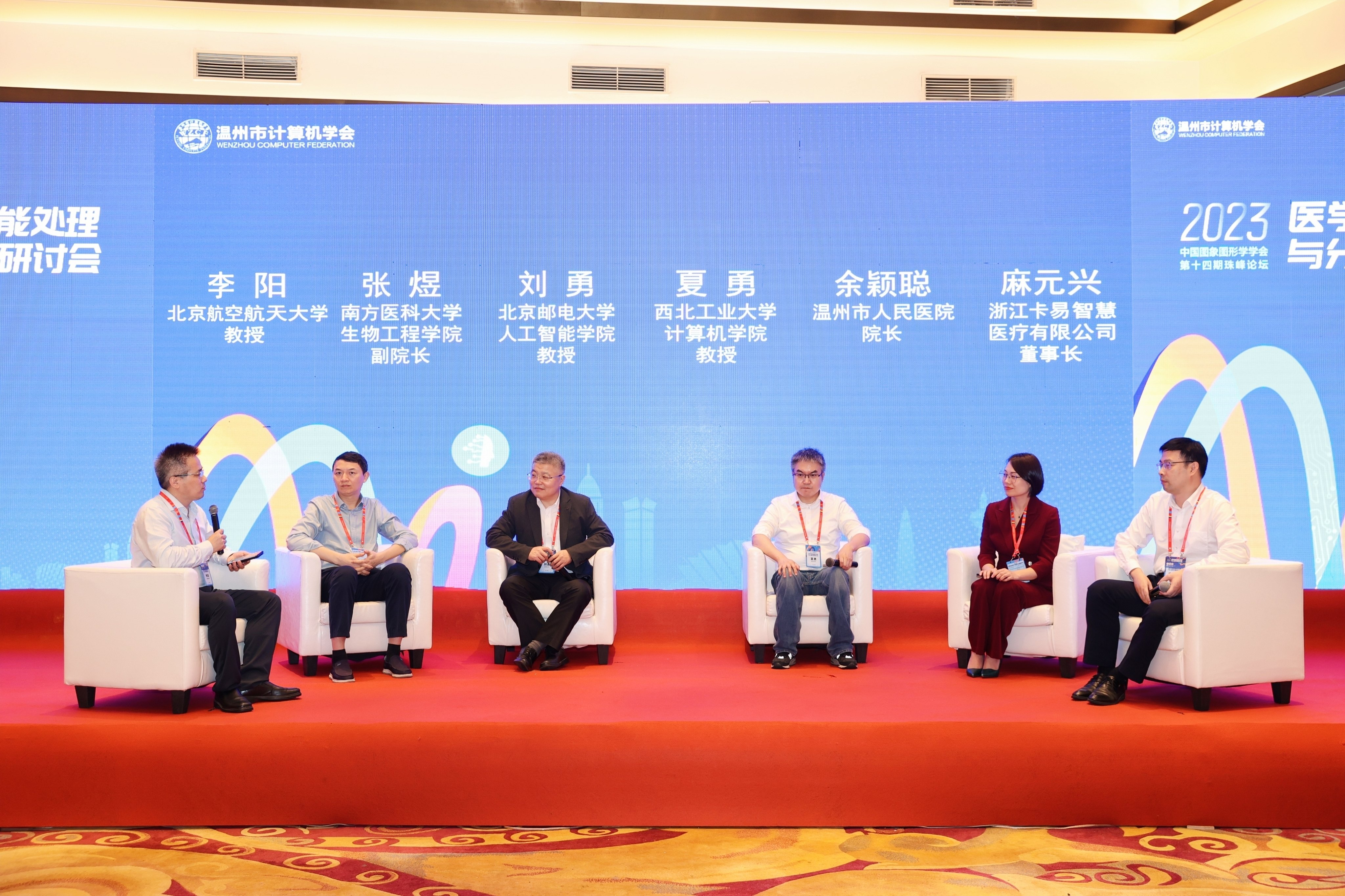 论坛圆桌讨论环节以“大模型时代的医学影像AI研究:机遇与挑战”为主题开展相关讨论,由北京航空航天大学李阳教授主持。报告嘉宾夏勇教授、刘勇教授和南方医科大学生物医学工程瓜子tv 副院长张煜、温州市人民医院院长余颖聪、浙江卡易智慧医疗有限公司董事长麻元兴五位专家学者围绕相关问题发表观点,进行深入的讨论。