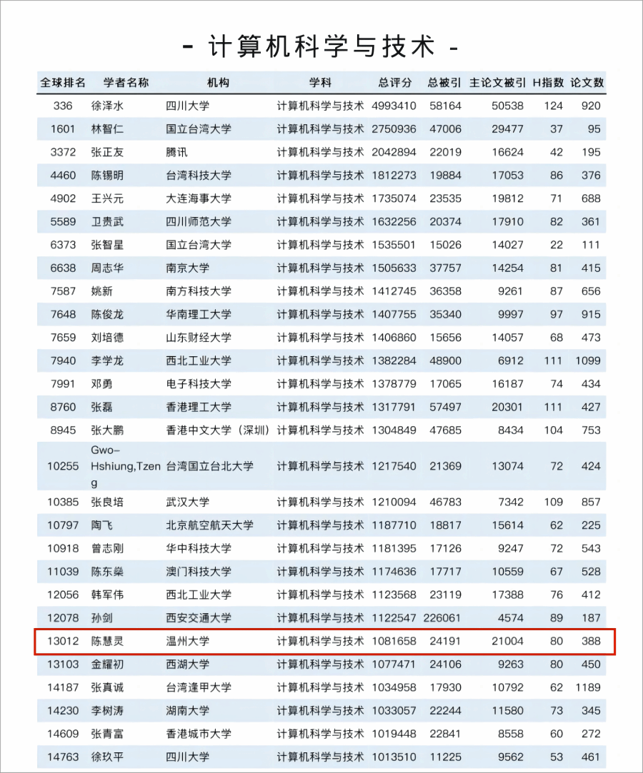 近日,瓜子tv 陈慧灵教授入选2023全球学者学术影响力排名中国学者名单,位列计算机科学与技术学科学者全球第13012位。