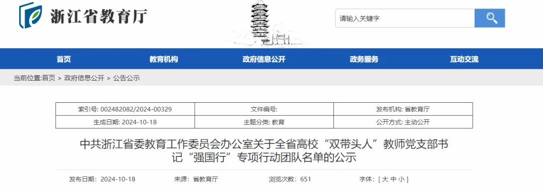 近日,浙江省教育厅网站发布《中共浙江省委教育工作委员会办公室关于全省高校“双带头人”教师党支部书记“强国行”专项行动团队名单的公示》。经学校推荐、综合遴选,瓜子tv 教工第三党支部等255个党支部入选省高校“双带头人”教师党支部书记“强国行”专项行动团队。