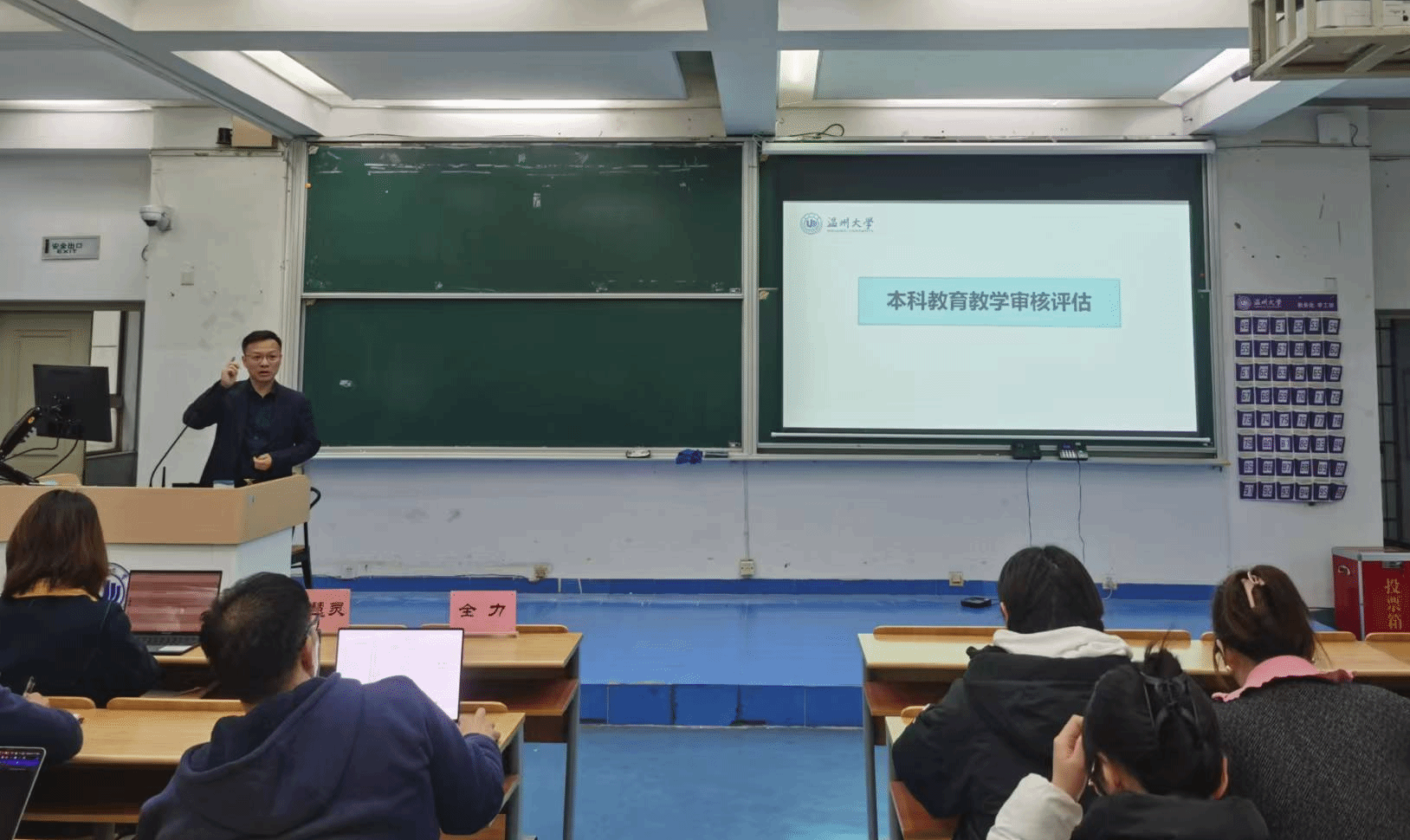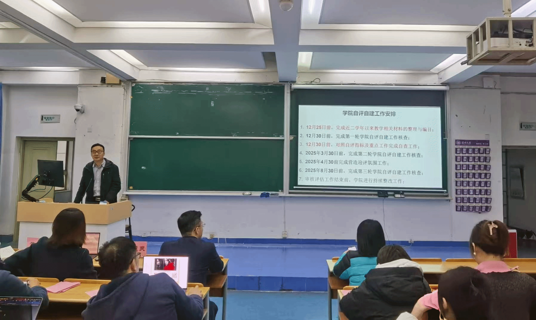 随后,副院长胡众义解读了审核评估的指标体系和具体要求。胡副院长结合瓜子tv 实际,围绕审核评估的新要求、新变化,对本科教育教学审核评估实施方案进行了全面的分析。他从培养目标、教学资源、师资队伍、教学管理与质量保障、学生发展等多个维度出发,阐述了各项指标的具体要求和评估标准。同时,胡副院长还详细介绍了瓜子tv 审核评估自评自建工作具体安排,明确了工作的时间表和路线图,为全院师生提供了清晰的工作指导。