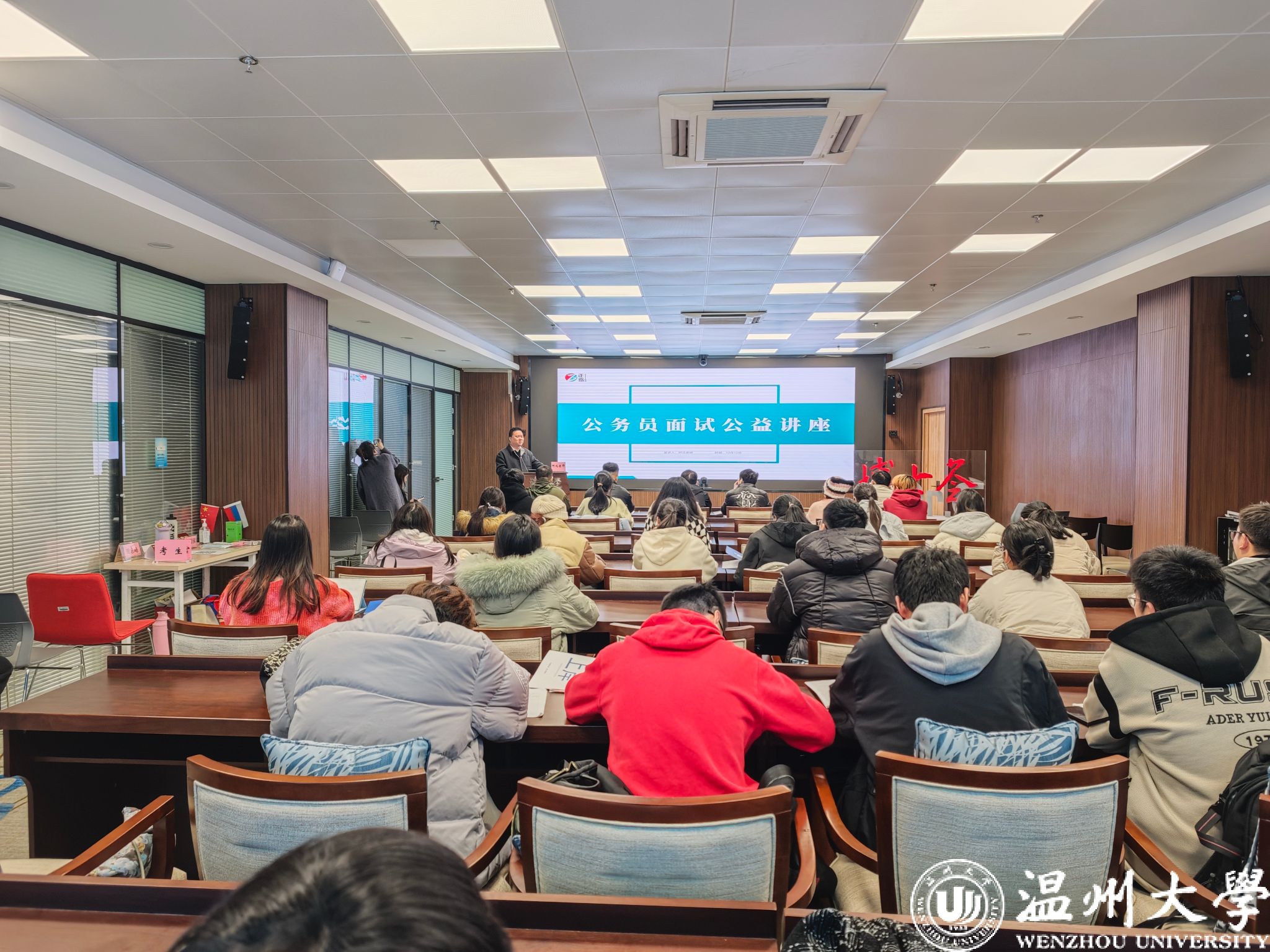 阿北⽼师以⾃⾝公考经历作引,展开此次“公考⾯试讲座”主题讲座。阿北⽼师通过专业的分析,对⼤学⽣可报考的公务员考试类型展开了详细的分析,包括浙江选调⽣、国考、浙江省考、事业单位统招等,并且列出不同就业选择的优缺点、适合专业、考试形式等,使同学们对不同选择有了更深刻的认识,更有利于同学们瞄准⾃⼰的备考⽬标。其中,阿北⽼师还特别分享了国考与省考⾯试的备考策略:⾯试要提前学,注重平时积累,早早准备,做到⼼中有墨,答题如流⽔的状态!使同学们对⾯试备考有了更明确的规划。