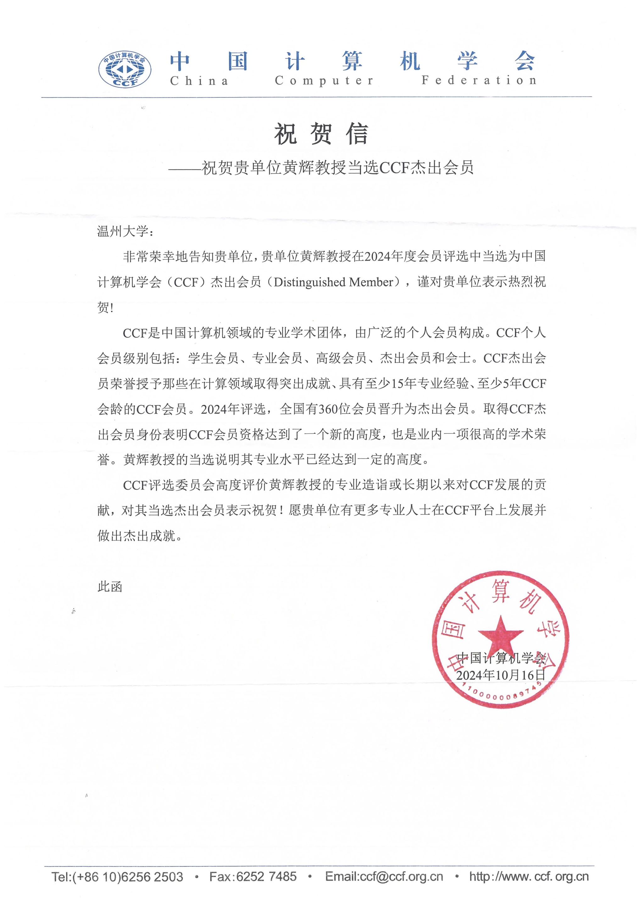 近日,中国计算机学会(CCF)发来贺信,祝贺瓜子tv 黄辉教授当选中国计算机学会(CCF)杰出会员(Distinguished Member)。