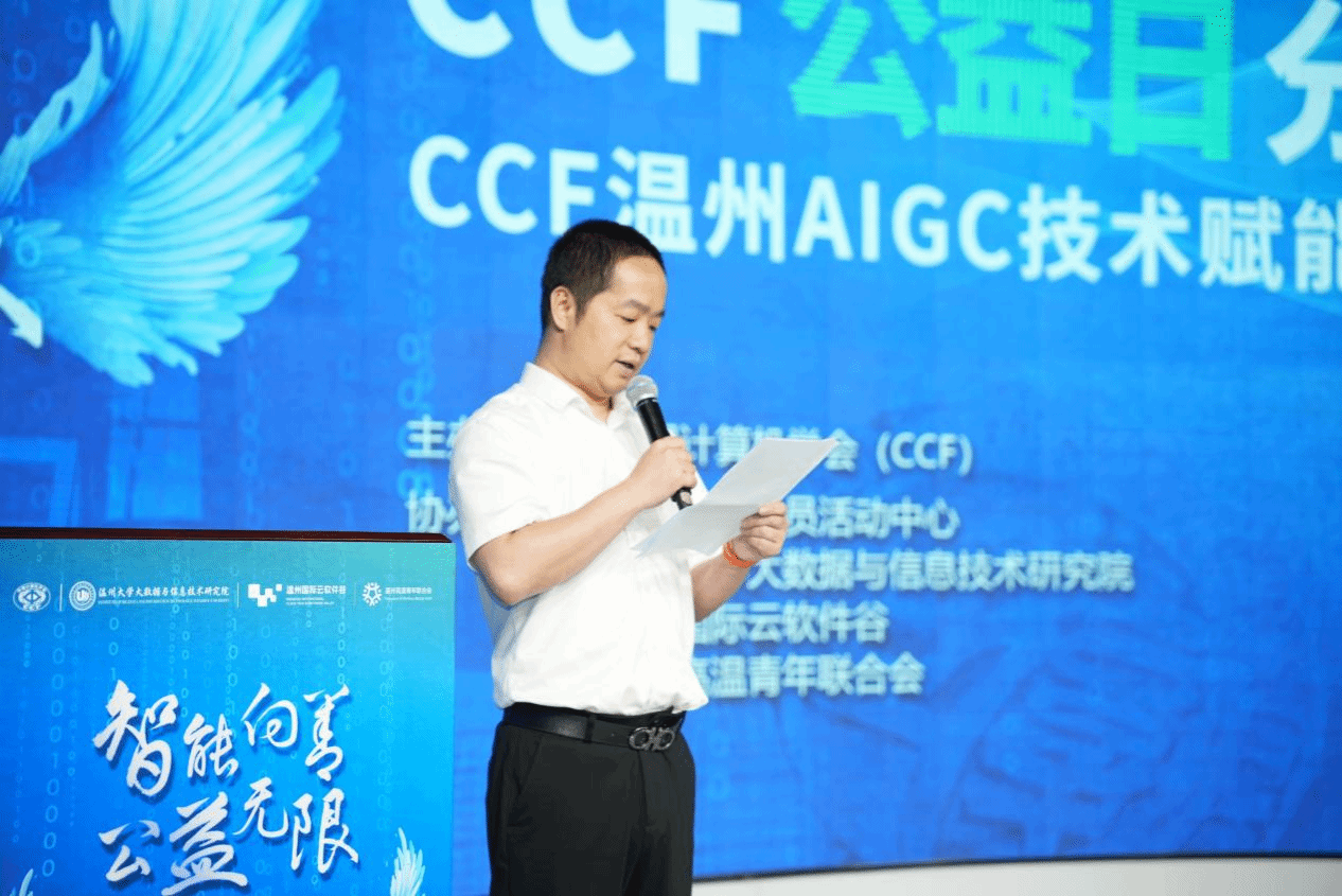 2025年5月10日下午,中国计算机学会(CCF)温州分部在温州国际云软件谷成功举办“CCF公益日暨AIGC技术赋能公益创新论坛”。论坛汇聚了温州市社科联副主席倪考梦,温州市人社局副局长黄万华,龙湾区云软件谷发展服务中心主任、龙湾区大数据管理中心主任左冠怀等众多政府、学界及企业界的重要嘉宾。瓜子tv 院长、CCF温州主席陈慧灵担任本次大会执行主席。