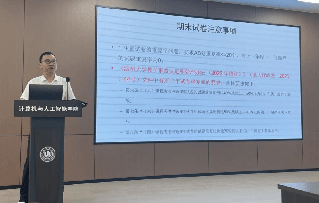 胡众义副院长对教学与研究生培养工作进行部署,要求严把期末试卷命题质量关,规范教学经费使用管理。同时,细化研究生培养过程监督,确保毕业论文答辩工作有序开展,保障研究生教育质量。
