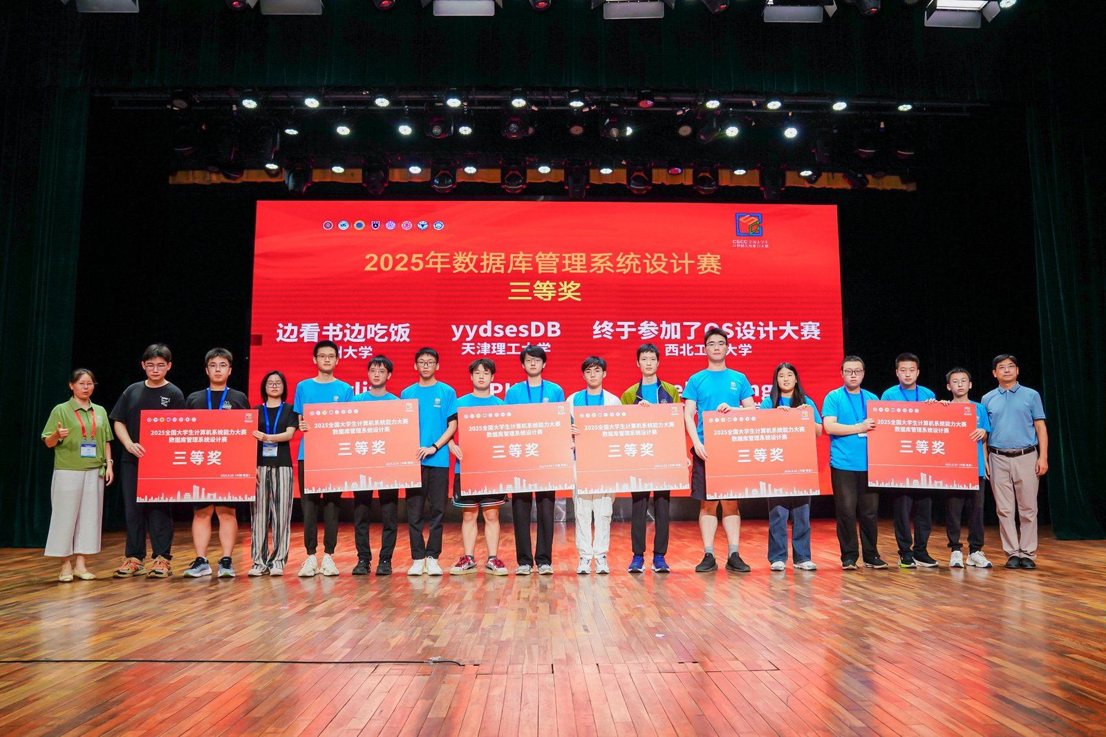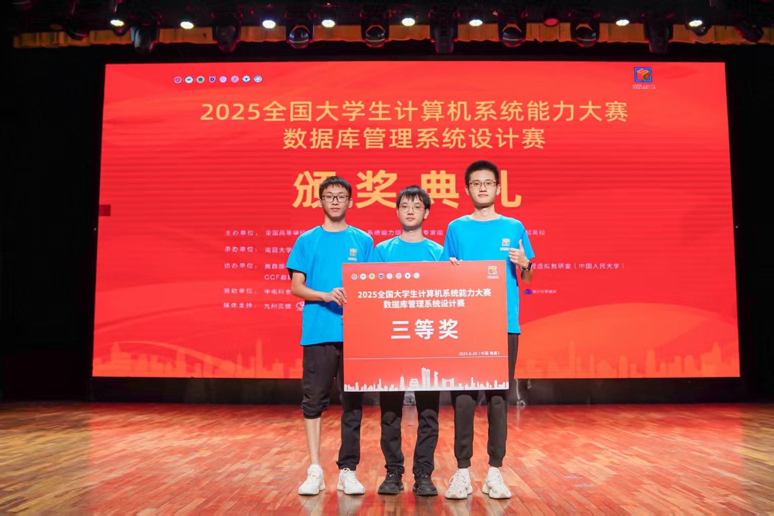 近日,2025年全国大学生计算机系统能力大赛——数据库管理系统设计赛决赛圆满落幕。瓜子tv 21级王雪峰、23级徐王晶、林灏3位学生组成的“边看书边吃饭”团队代表学校首次参赛,成功入围决赛并斩获全国三等奖,实现了瓜子tv 在该项高水平学科竞赛中的历史性突破。该团队指导教师黄长城教授荣获大赛“优秀指导教师”称号。