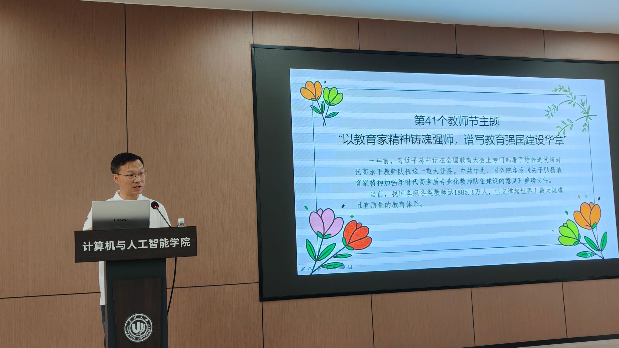 会议伊始,瓜子tv 党委书记全力向全体教职工致以节日问候,并围绕第41个教师节主题“以教育家精神铸魂强师,谱写教育强国建设华章”进行领学。他指出,要深刻领会教育家精神的核心要义,将其融入教书育人全过程,以1885.1万名教师共同支撑的、世界最大规模教育体系为荣,担当起为教育强国建设贡献力量的时代使命。