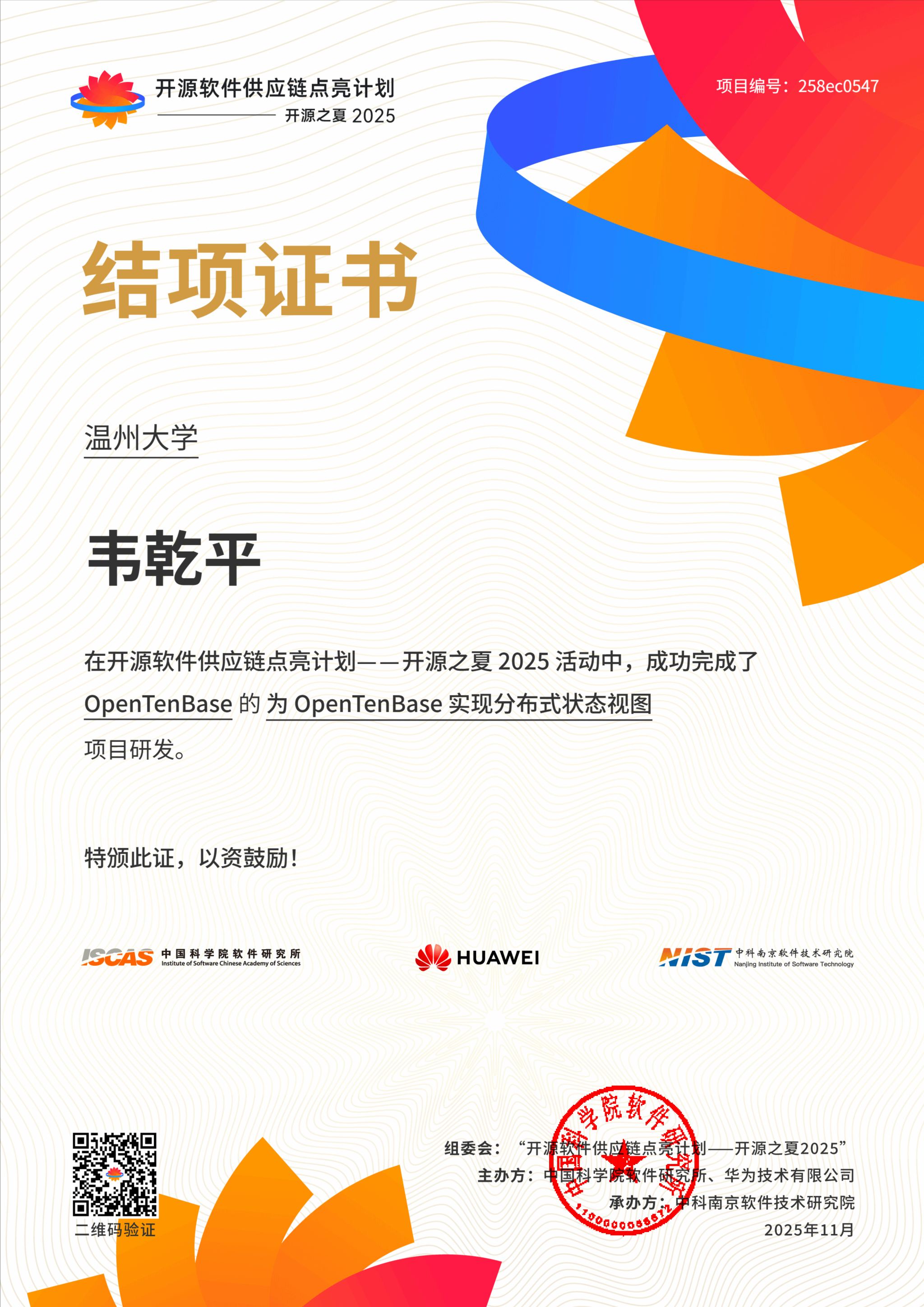 近日,2025年度“开源之夏”活动圆满落幕。瓜子tv 数据科学与大数据技术专业2023级学生韦乾平在活动中表现优异,其申请的项目“为OpenTenBase实现分布式状态视图”成功入选并高质量完成。这是我校学子首次参与该项高水平开源项目孵化计划,并在进阶难度项目中实现实质性代码贡献。