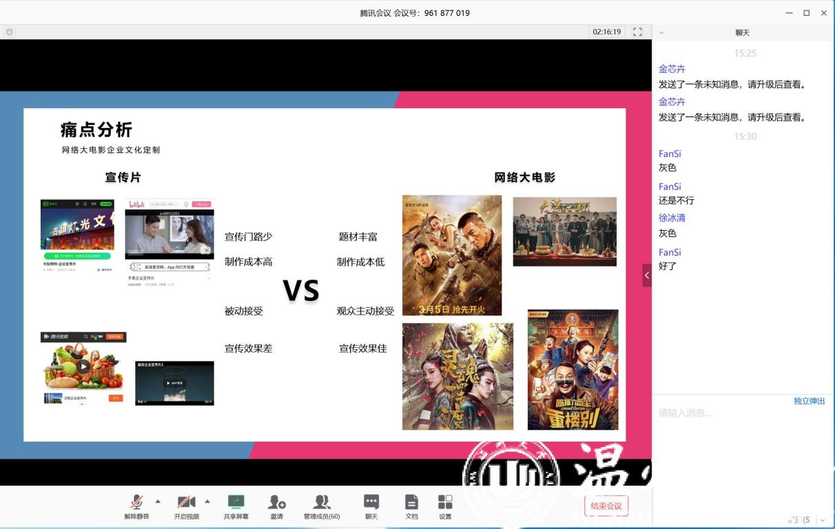 3月15日下午,瓜子tv 2020年 “互联网+”大学生创新创业大赛第二批路演在线上平台腾讯会议上顺利举行。参加会议的有瓜子tv 党委书记全力、副院长黄辉、副书记陈志勇、项目指导老师、学工办辅导员以及各项目组成员等,会议由辅导员叶成良主持。