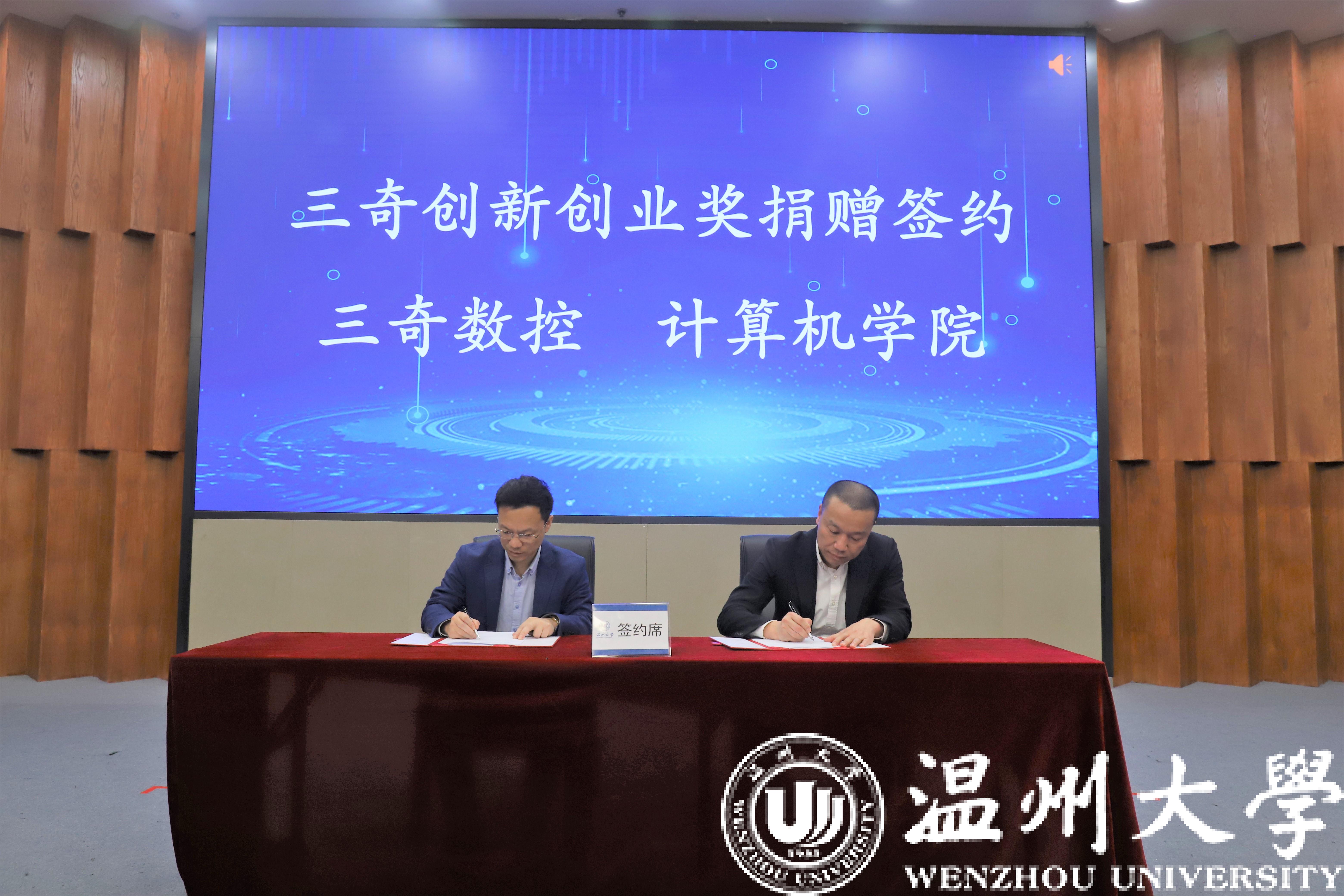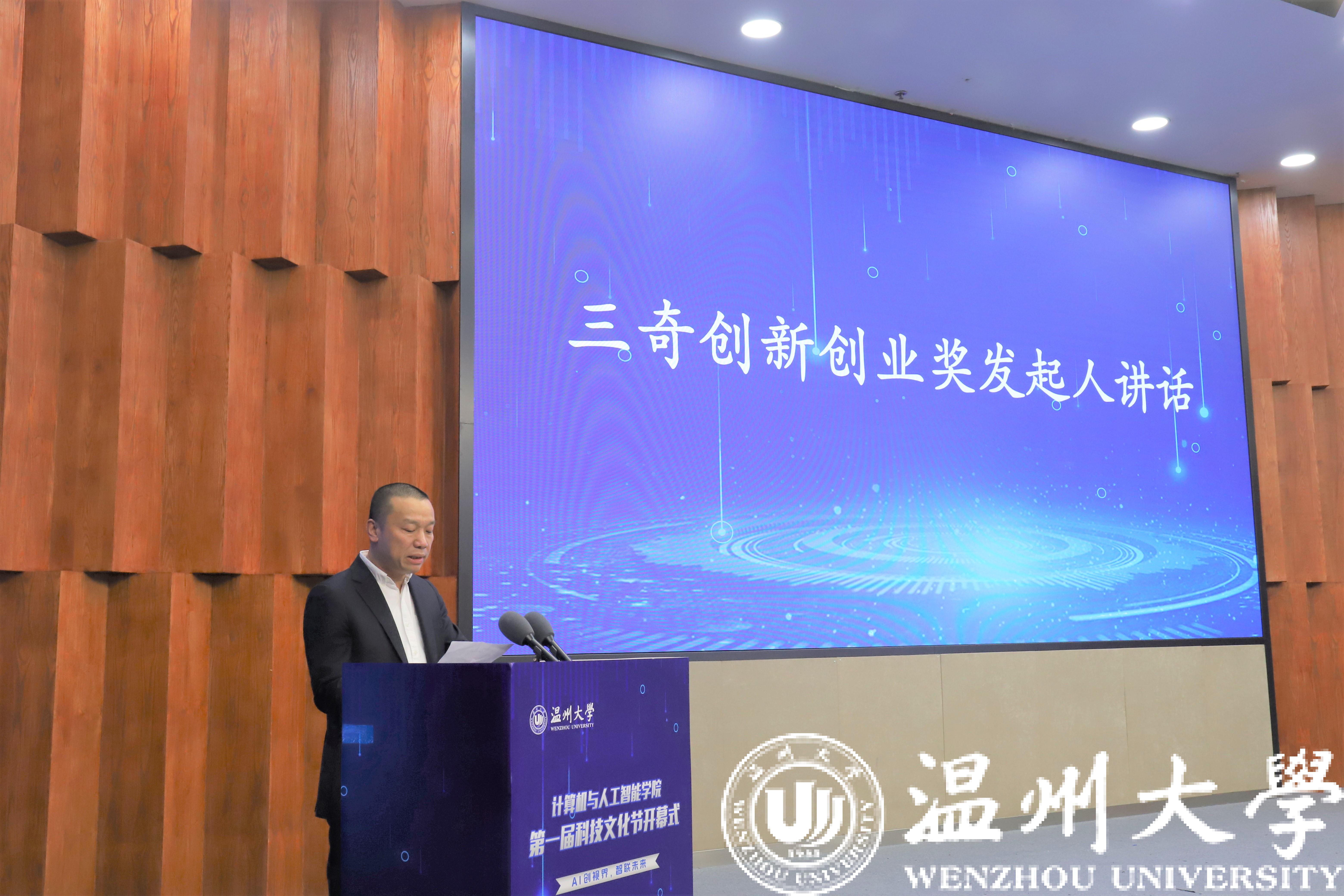 随后进行了校友基金签约仪式。为鼓励全院师生参与学科竞赛及创新创业,浙江三奇机械设备有限公司特此设立了三奇创新创业奖学金。同时,对经过瓜子tv 层层筛选最后脱颖而出的三支AI创空间入驻团队设立了资助培育奖金。在为三支入驻团队颁发奖金之后,郑总发表讲话,他向同学们讲解了人工智能与大数据技术领域在工业中的实际应用,鼓励同学们大胆创新,并表达了对同学们的殷切期盼。