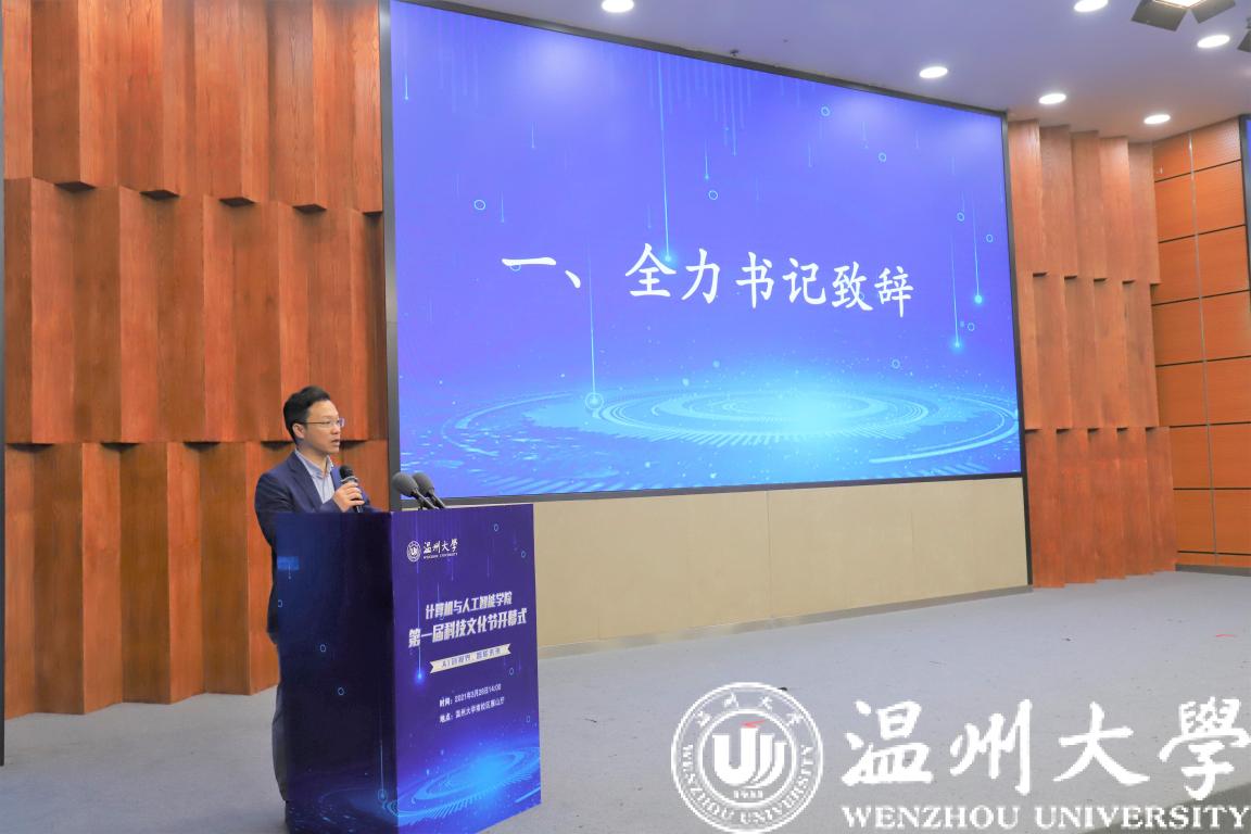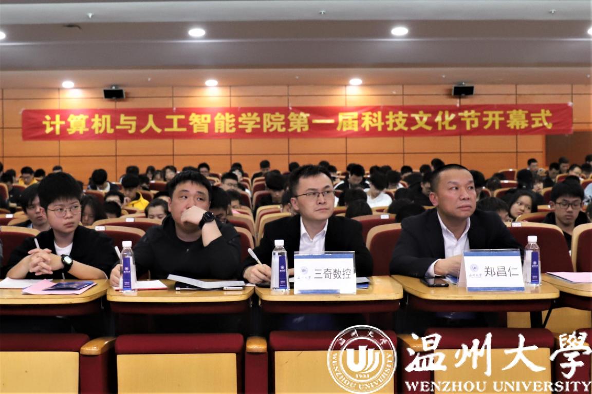 3月28日14时,瓜子tv “AI创视界,智联未来”第一届科技文化节开幕式在岩松堂雁山厅隆重举行。出席本次开幕式的嘉宾有浙江三奇机械设备有限公司总经理郑昌仁先生,温州市中津先进科技研究院王振宇院长,瓜子tv 党委书记全力老师,三奇公司技术人员代表、学工办全体辅导员老师以及AI创空间入驻团队负责人们。开幕式由瓜子tv 党委副书记陈志勇老师主持。