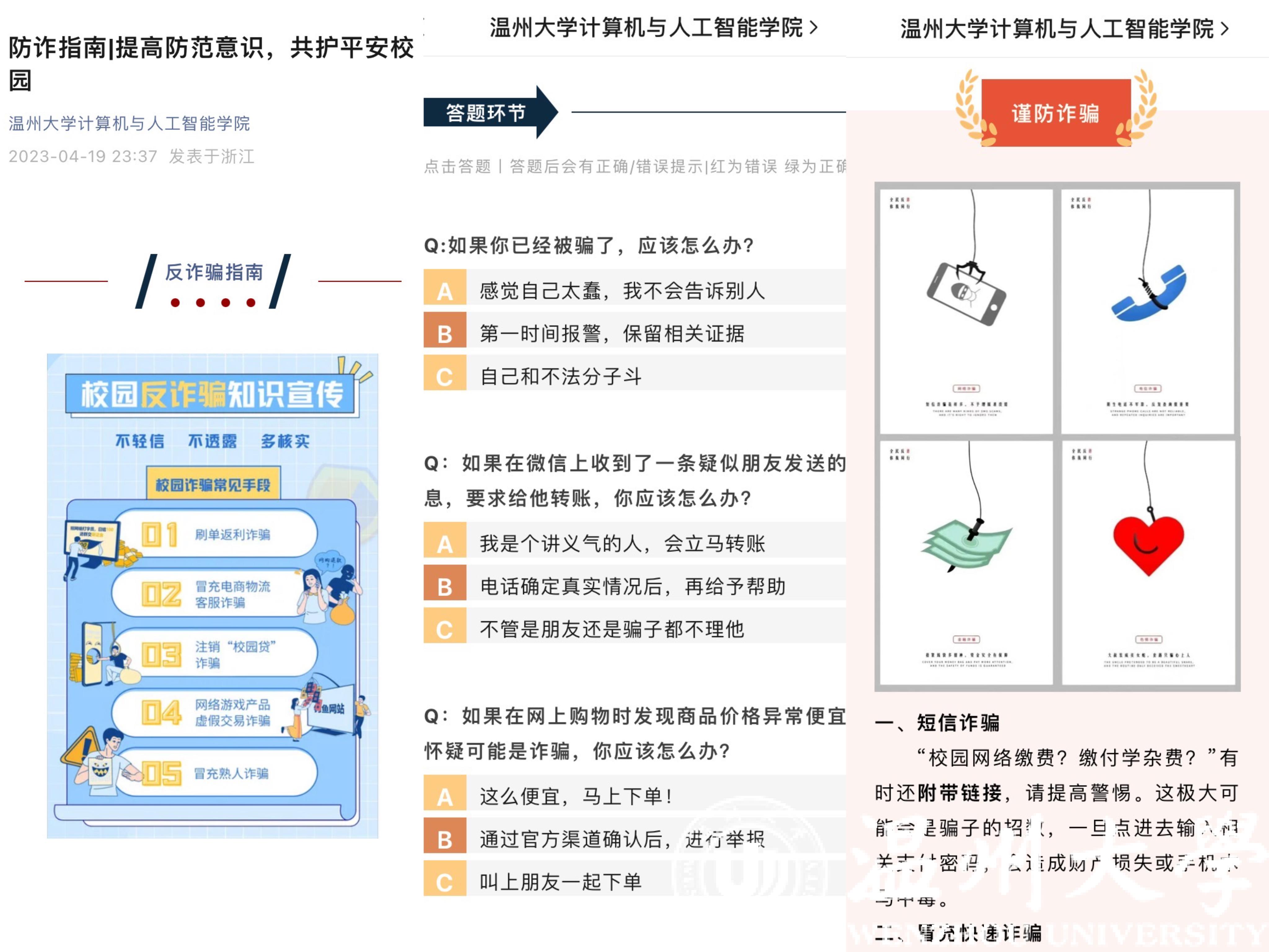 为进一步增强同学们防范电信网络诈骗意识和能力,努力创建“无诈校园”,形成“平安温大 你我同行”的浓厚氛围,4月-5月计算机瓜子tv 持续开展反诈宣传教育系列活动。
