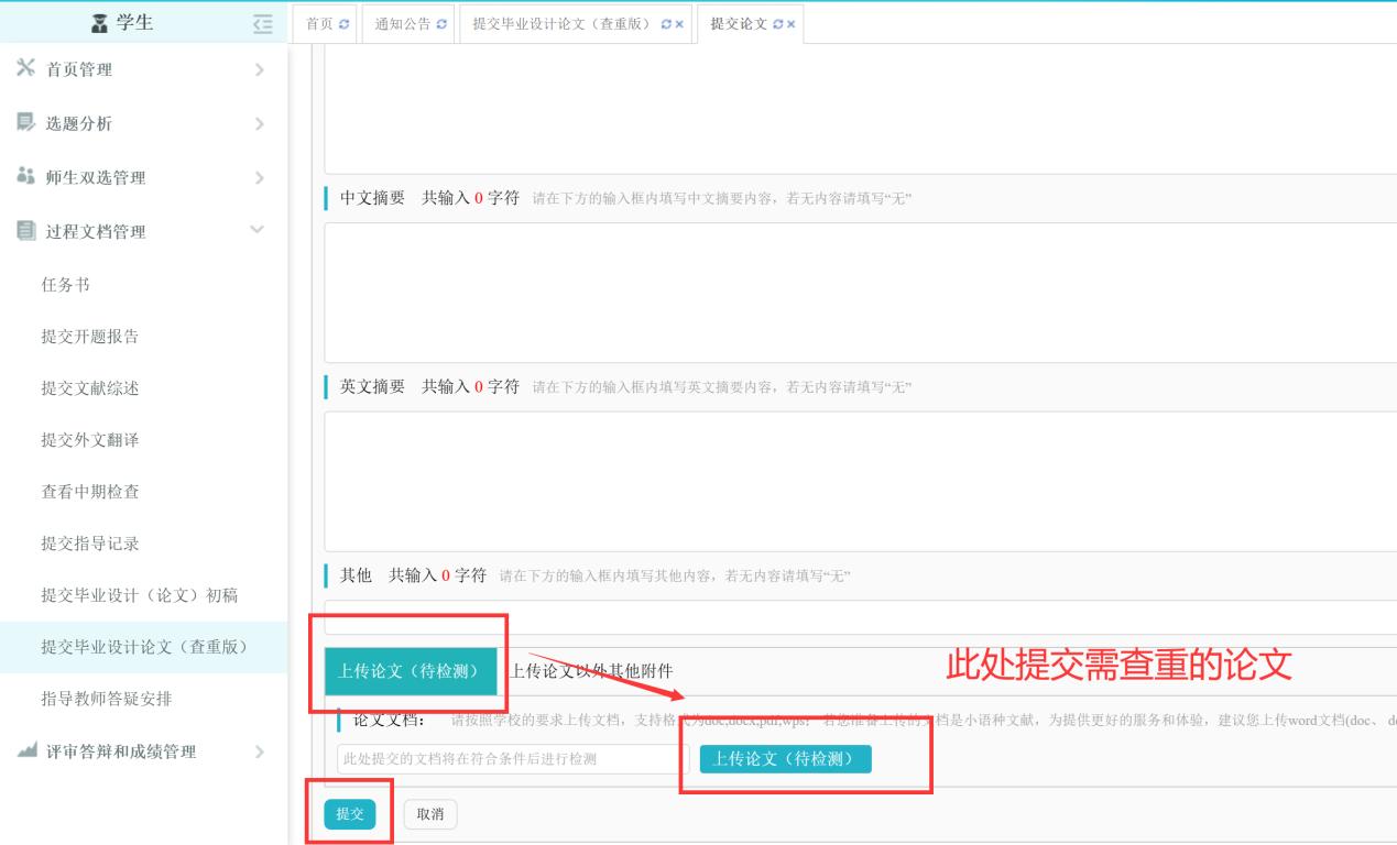 2.提交方式(此处为重要提示):学生将论文上传至过程文档管理-提交毕业设计论文(查重版),指导教师(审核通过)后,系统会自动查重。如指导教师(返回修改),系统将不查重,由学生修改后原地重新提交,直至(审核通过)才会查重。