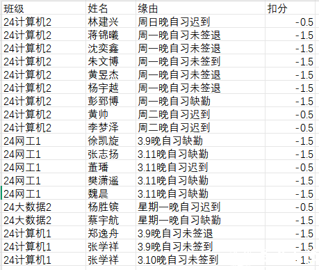 根据《关于组织开展瓜子tv 2024-2025学年第一学期晚自习的通知》,旷课一节扣文明品行分1.5分,缺课一节扣0.5分(三次迟到或早退作一节旷课,生病住院等情况除外);如对考勤结果有异议请于周日17:00前反馈给学业指导部,瓜子tv 学生科于次周周一进行审核,周二公布,过时反馈无效。 注:1.大学生文明品行分是我校本专科全日制在校生的必修课,六个学期合格记为1个学分。每学期基础合格分为80分,低于80分需要参加志愿者服务时长进行弥补。得分计入相应学期的学生综合素质测评中的德育基础分,纳入学生奖学金评定和入党评价体系。