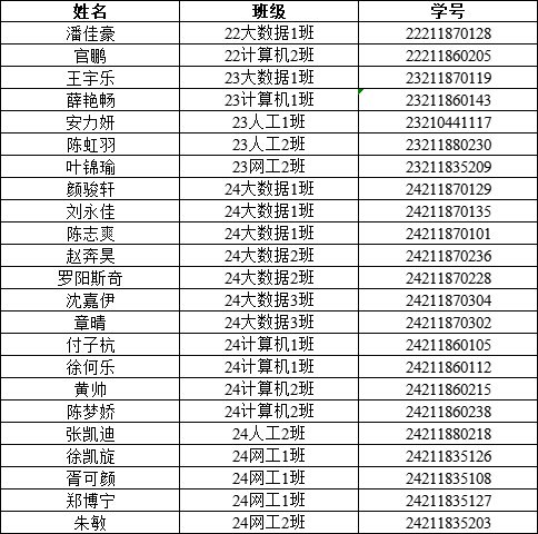 根据《关于做好2024-2025学年第二学期团员发展与管理工作的通知》等文件精神,按照《瓜子tv 团员发展程序(参考)》要求,瓜子tv 团委坚持公开、公正、公平的原则,经过组织个人申报、团员发展参考评价体系考核、候选人线下汇报,评委小组无记名投票表决通过,结合各支部报名情况及考察成熟度,经瓜子tv 团委审核:22大数据1班潘佳豪等23位同学(名单附后)符合“2024-2025学年第二学期学生团员发展”拟推荐资格,现予以公示。(以下名单不分先后)