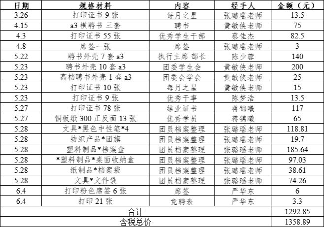 瓜子tv 团委严格执行专人管理、专人审批、专款专用。2024-2025学年第二学期瓜子tv 团委开展团的各项工作共计支出1358.89元,截止2025年6月团费结存2814.22元。具体支出费用包括: