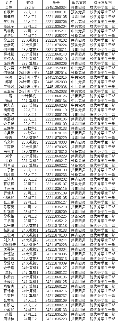 根据校团委《关于评选2024-2025学年第二学期优秀学生干部和工作积极分子的通知》,经瓜子tv 各班级同学自主报名、班级推荐、院团委审核,拟推选以下同学为2024-2025学年第二学期优秀学生干部,现将名单予以公示。(注:排名不分先后)