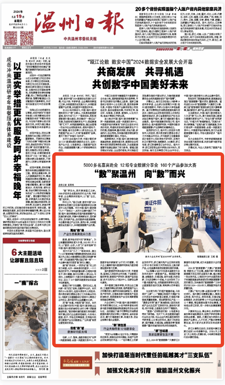 昨天(5月18日)上午,“瓯江论数 数安中国”2024数据安全发展大会在温州瓯海国际会议展览中心拉开帷幕。作为中国(温州)数安港“九个一”架构之一,本次大会集中展示了中国(温州)数安港建设和温州数据要素产业发展的新成果,并集中授牌新试点,签约新项目,发布新产品,启动国家级数据赛事。与会嘉宾通过产业交流、案例分享,共商数据安全发展大计,共寻数据要素产业机遇。