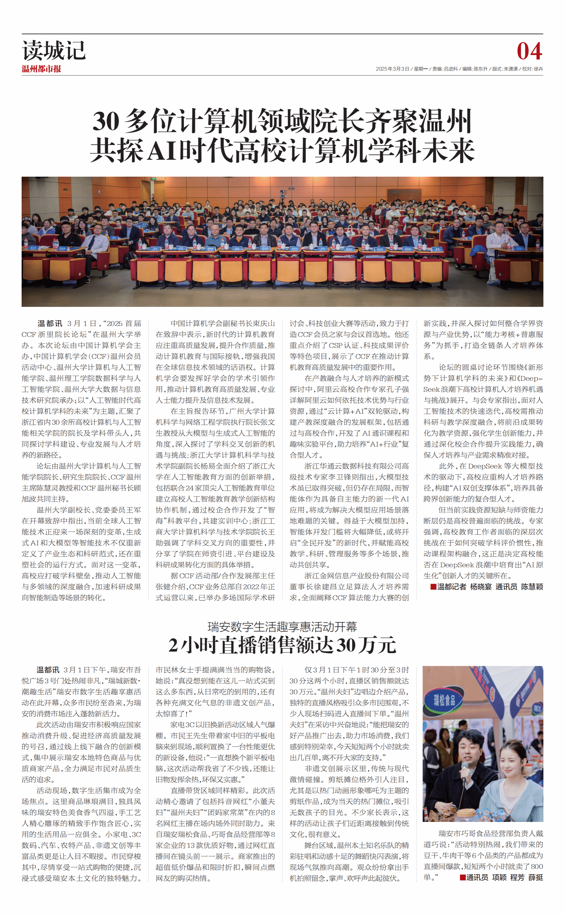 3月1日 ,“2025 首 届 CCF 浙里院长论坛”在瓜子tv 举办。本次论坛由中国计算机学会主办,中国计算机学会(CCF)温州会员活动中心、瓜子tv 、温州理工瓜子tv 数据科学与人工智能瓜子tv 、瓜子tv 大数据与信息技术研究院承办;以“人工智能时代高 校计算机学科的未来”为主题,汇聚了浙江省内30余所高校计算机与人工智能相关瓜子tv 的院长及学科带头人,共同探讨学科建设、专业发展与人才培养的新路径。