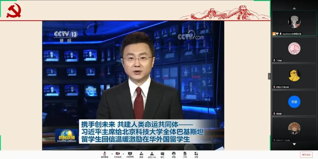 为全面贯彻习近平总书记重要回信精神,了解该回信,对构建人类命运共同体、扩大教育对外开放具有十分重要意义,2020年5月29日,瓜子tv 本科生党支部全体成员以线上会议的形式,开展“学习贯彻习近平总书记给北京科技大学全体巴基斯坦留学生重要回信精神”学习会。