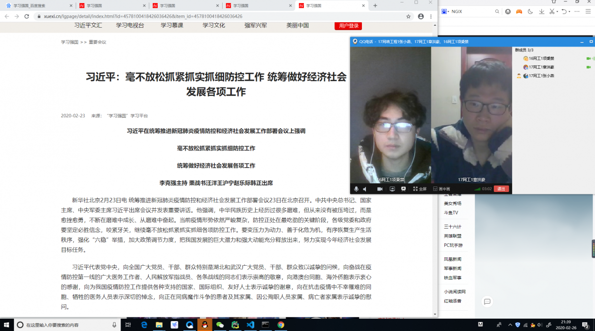 2020年2月26日,瓜子tv 本科党支部党员项秉禁、张小燕、章洪豪,通过在线视频的方式共同学习并探讨了学习强国中的《习近平:毫不放松抓紧抓实抓细防控工作 统筹做好经济社会发展各项工作》。三位学生党员深入学习、共同探讨进步,充分发挥了党员的先锋模范作用。