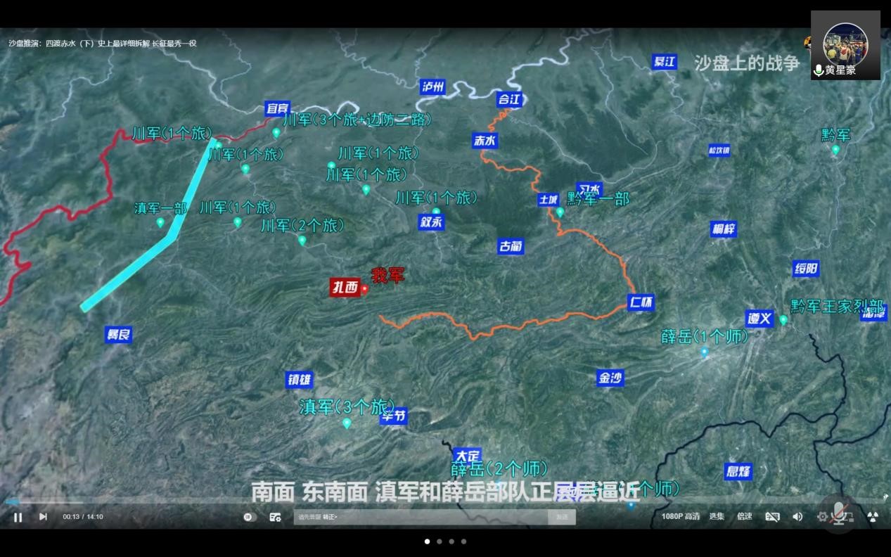 最后,学习会以播放视频《长征过程-四渡赤水沙盘推演》作为结尾。视频以“四渡赤水”为切入点向我们展示了长征时期红军所面临的局势以及中国共产党的优秀战略部署。