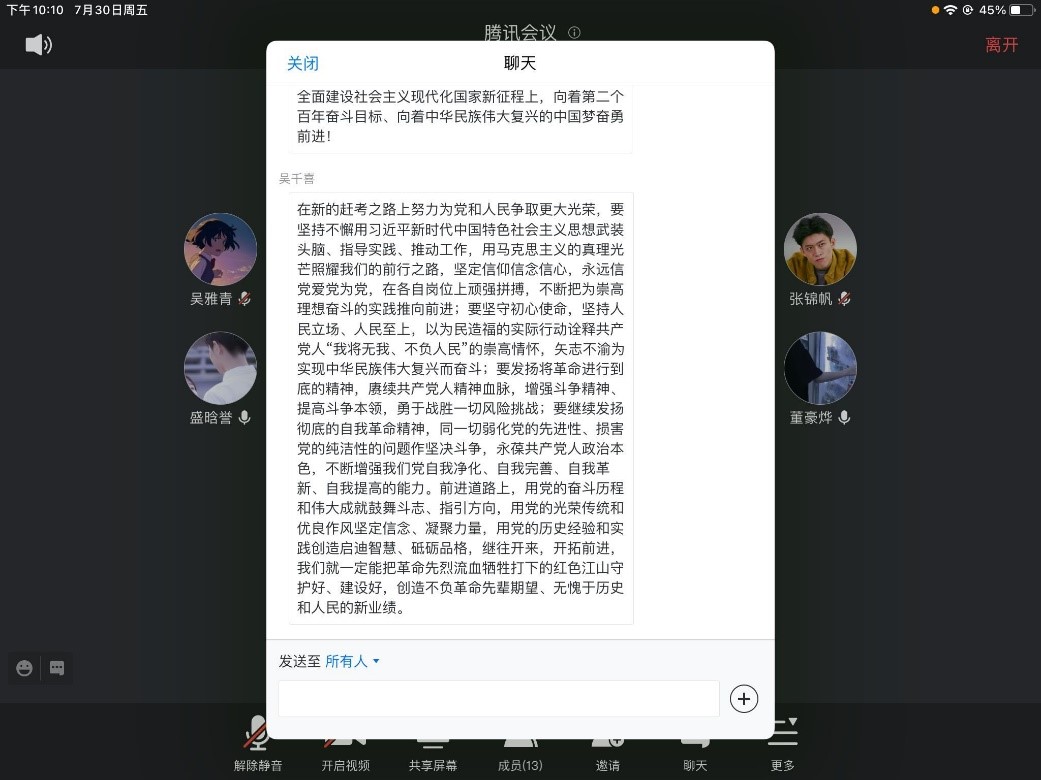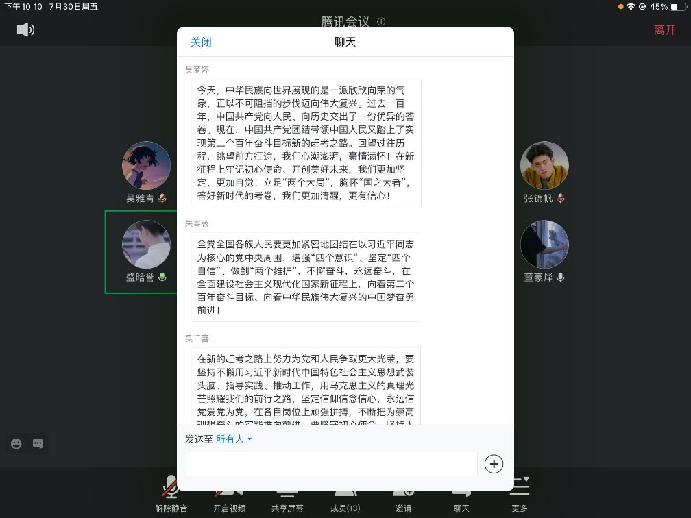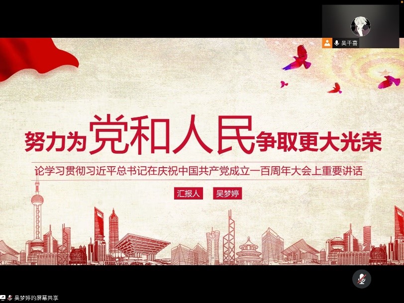 2021年7月1日,我们迎来了建党100周年华诞,习近平总书记在庆祝中国共产党成立100周年大会上发表了重要讲话,向世界宣示了坚持和发展中国特色社会主义的坚定决心。2021年7月30日晚,瓜子tv 本科生第一党支部召开了由吴梦婷同学主持的学习会,学习习近平总书记此次重要讲话,共有4名正式党员和10名预备党员到会。