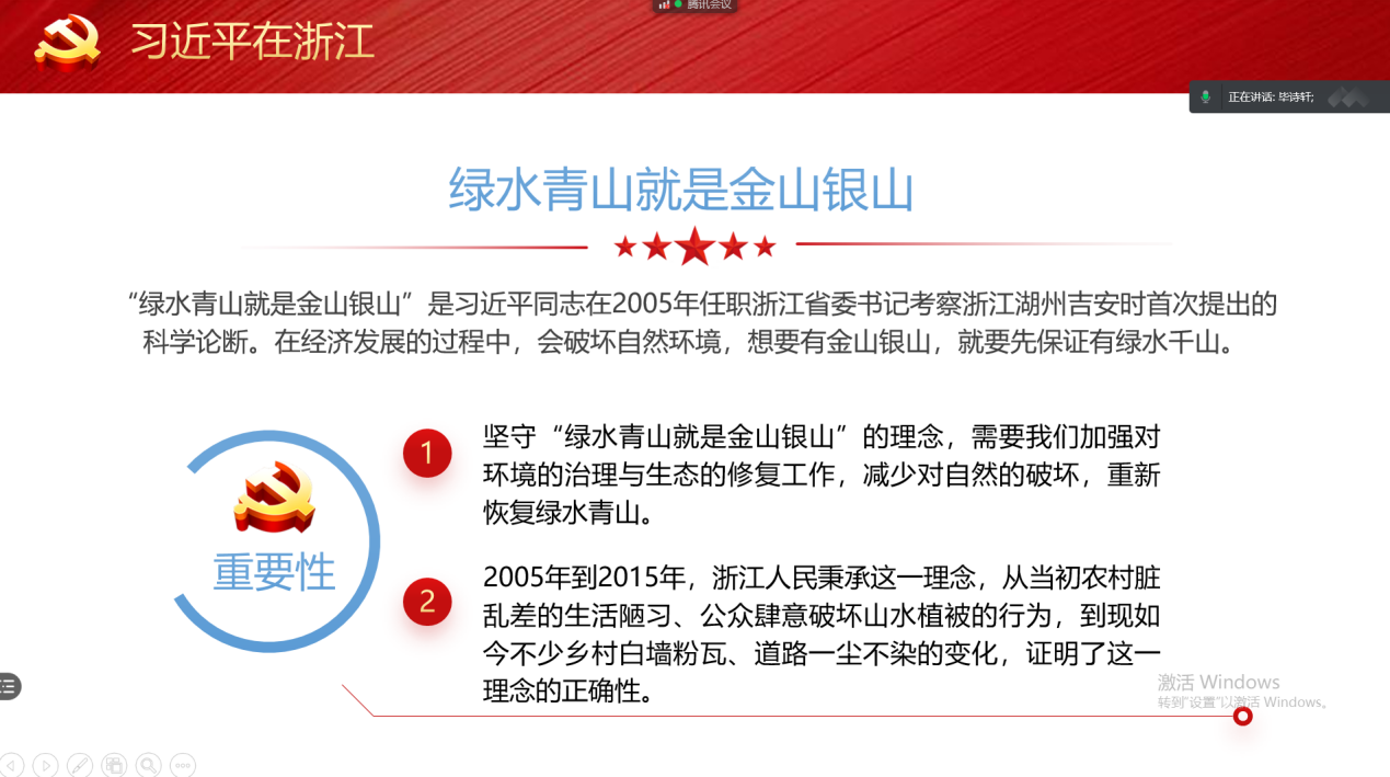 第二环节,毕诗轩同志带领大家共同学习了《习近平在浙江》的重要思想,对“绿水青山就是金山银山”、“精准扶贫”等概念进行了讲解,号召同志们认真学习领会,形成思想力量和精神力量,完成时代赋予我们这代人的重任。