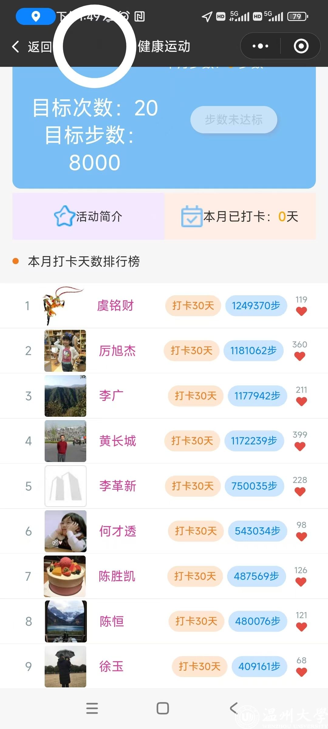 三、活动内容:微信步数每天满8000步成功打卡1次,一个月满20次可以积分20分,打卡天数排名前60%获得优胜奖,奖励精美礼品一份。另外,步数排名第1的会员获得一等奖,第2至3名获得二等奖,第4至5名的获得三等奖。(不重复奖励)