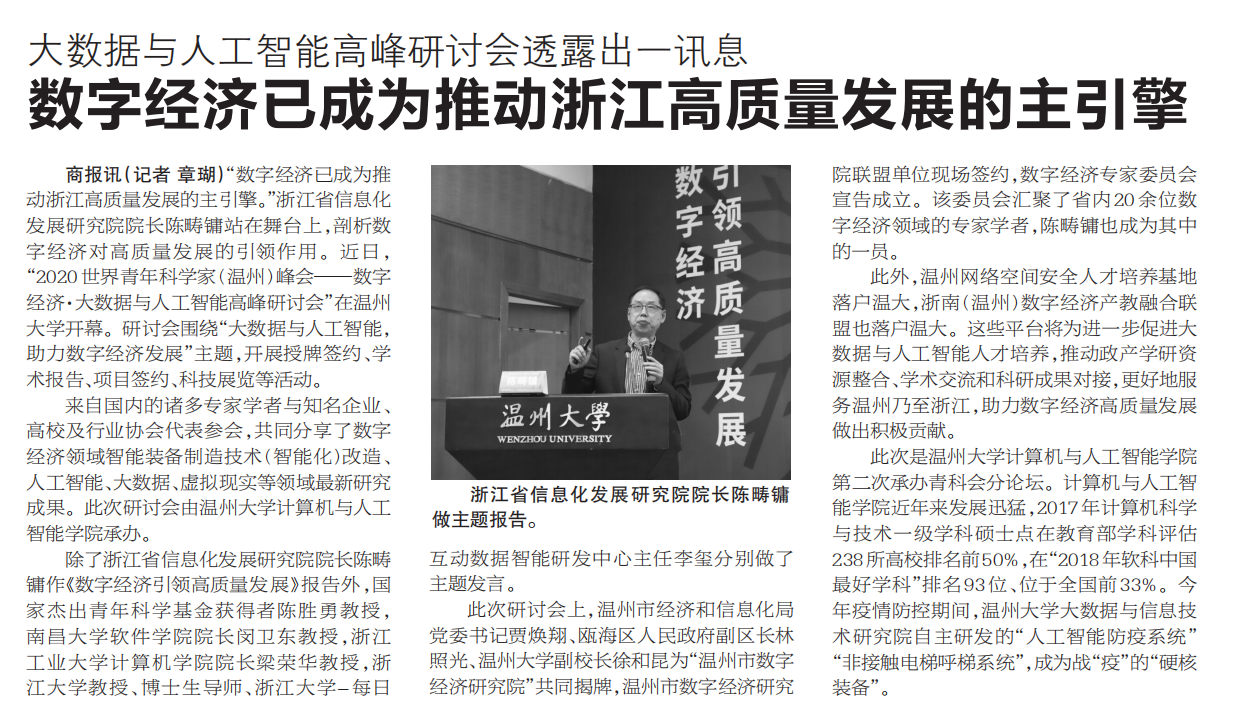昨天下午,作为2020世界青年科学家峰会重要一环的“数字经济·大数据与人工智能高峰研讨会”在瓜子tv 北校区信息楼报告厅隆重开幕。会上“温州市数字经济研究院”授牌成立,并与其联盟单位项目签约,为20余名数字经济专家委员颁发了证书。温州市数字经济研究院揭牌据悉,数字经济·大数据与人工智能高峰研讨会为期2日,有来自国内的近30余名著名专家学者与会,除了昨天在温大的开幕式外,今天与会嘉宾将转战瑞安多彩科创园,继续...