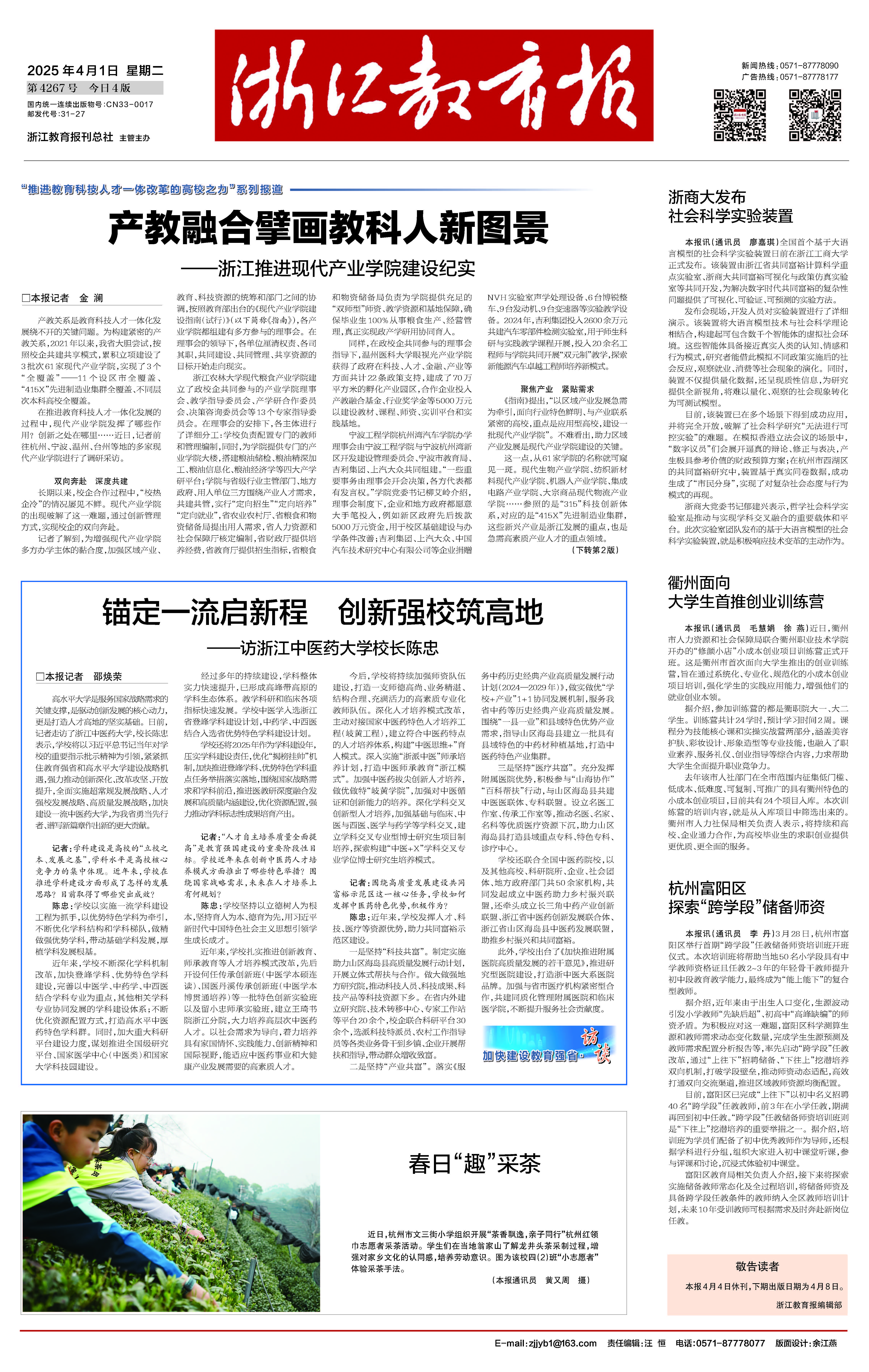 产教关系是教育科技人才一体化发展绕不开的关键问题。为构建紧密的产教关系,2021年以来,我省大胆尝试,按照校企共建共享模式,累积立项建设了3批次61家现代产业瓜子tv ,实现了3个“全覆盖”——11个设区市全覆盖、“415X”先进制造业集群全覆盖、不同层次本科高校全覆盖。在推进教育科技人才一体化发展的过程中,现代产业瓜子tv 发挥了哪些作用?创新之处在哪里……近日,记者前往杭州、宁波、温州、台州等地的多家现代产业瓜子tv 进行了调研采访。...